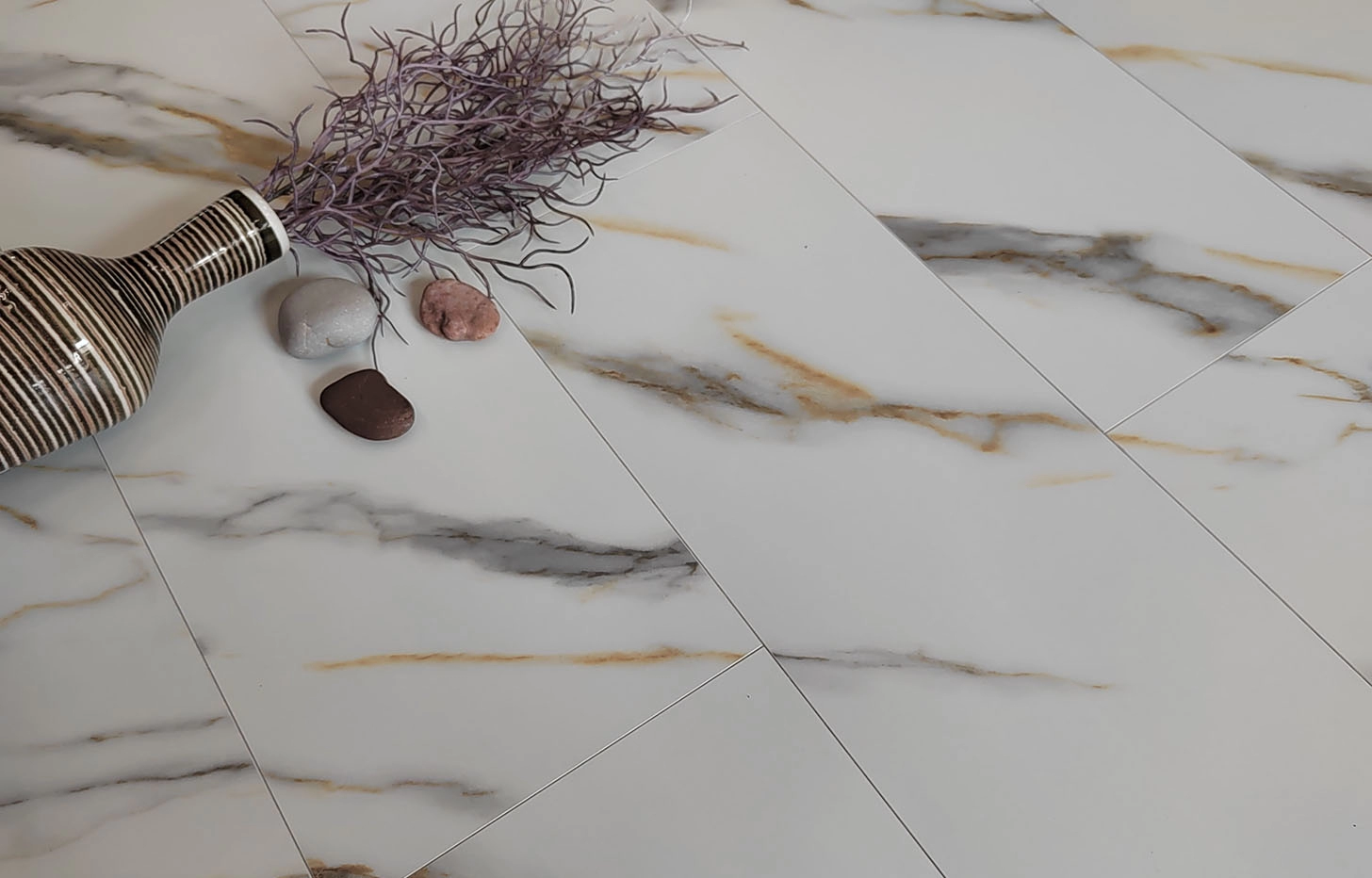 Минерально-каменный MSPC ламинат Мрамор Бело-Золотой — это декор, имитирующий изысканную текстуру белого мрамора, в формате большой крупной плитки (Big Stone) размером 1220*234 мм. Бело-золотой Мрамор имеет 4-сторонюю глубокую V-образную фаску. Так как сам материал обладает 100 % водостойкостью и крайне низким коэффициентом термореактивности, этот дизайн используют при укладке во всех зонах квартиры и зачастую там, где теплый пол является основным источником отопления. Без пороговая укладка в помещениях — до 240 м2. Возможность монтажа под тяжелую мебель — да. Возможность нагрева до +70° С без потери гарантии (может выдержать аварийный нагрев до + 114 С). Есть антивандальная обработка поверхности от появления царапин и выцветания на солнце.