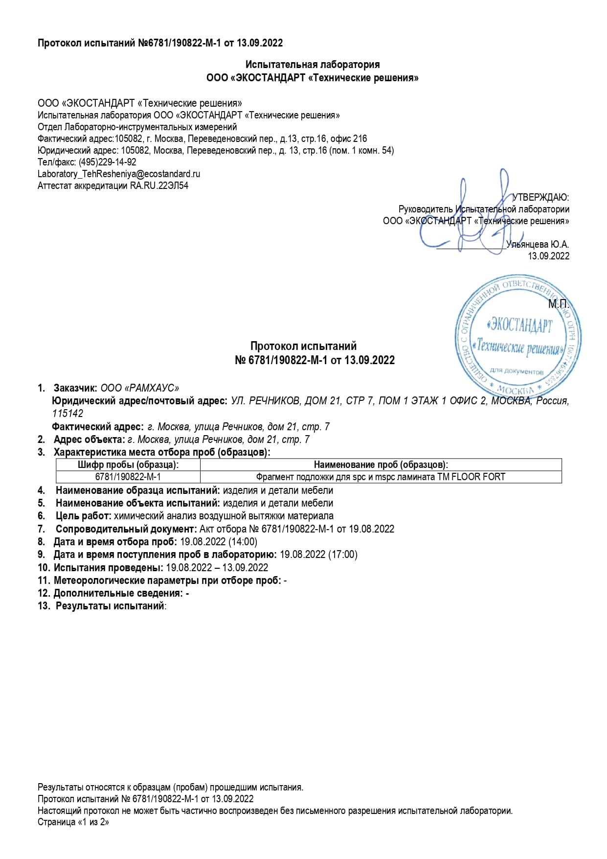 Делая ремонт, важно обращать внимание на безопасность любых используемых материалов. Подложка для spc и mspc покрытий Floor Fort® (Флор Форт) соответствует единым санитарно-эпидемиологическим нормам и гигиеническим требованиям СанПиН. С результатами протокола испытаний вы можете познакомиться ниже.